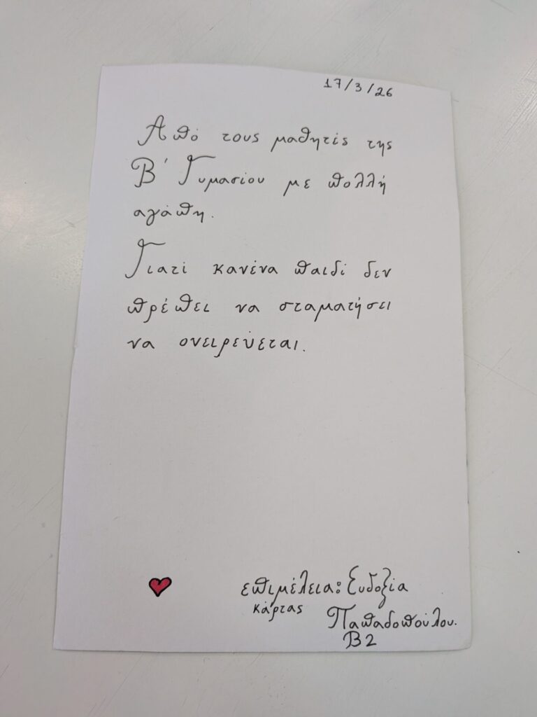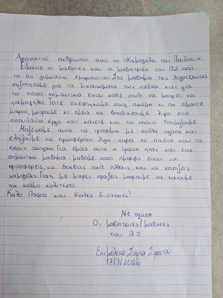 Στις 17 Μαρτίου πραγματοποιήθηκε η παράδοση ειδών διατροφής και πρώτης ανάγκης στον οργανισμό «Το Χαμόγελο του Παιδιού», τα οποία συγκεντρώθηκαν με πρωτοβουλία των μαθητών και μαθητριών της Β΄ Γυμνασίου και τη συμβολή των οικογενειών τους.